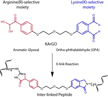 In order to obtain more structural information, Dr. Meng-Qiu Dong’s laboratory collaborated with Dr. Xiaoguang Lei’s laboratory of Peking University to develop crosslinkers that target arginine. This led to a series of crosslinkers called ArGO1-3each containing a polyethylene glycol chain with an aromatic glyoxal moiety attached to both ends. ArGO can covalently link the guanidine groups of two arginine residues with good selectivity. ArGO makes up for the deficiency of K-K crosslinkers, but the performance on different protein samples is uneven. To improve performance and increase the range of use, the authors replaced one end of the ArGO crosslinker with o-phtalaldehyde, which targets lysine, and named it KArGO. KArGO targets more amino acid residues on the surface of a protein, increases structural coverage, and performs stably well on multiple standard proteins. The authors further applied KArGO to multi-protein complexes such as CNGP and UtpA. The results showed that KArGO compensated for the deficiency of existing lysine crosslinkers and provided abundant complementary structure information.
