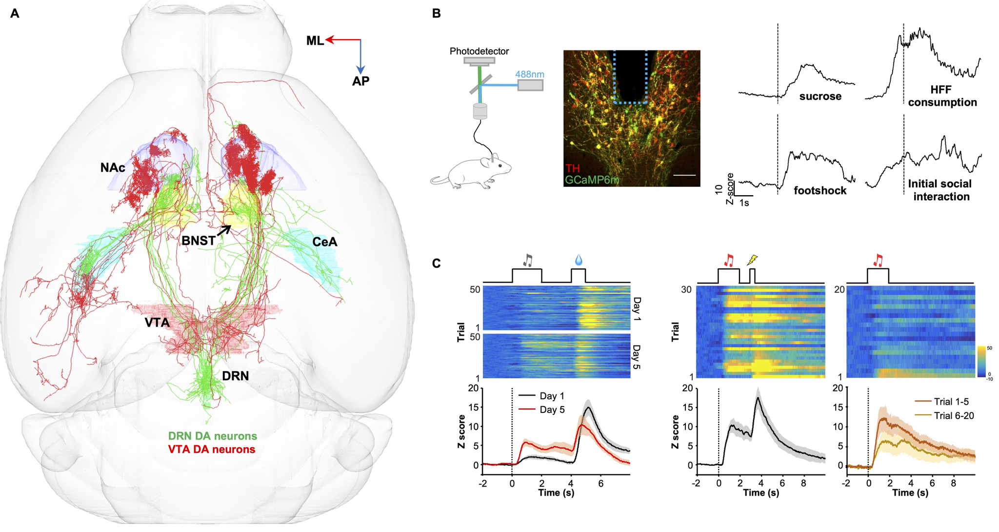 Notably, the DRN harbors a major extra-VTA DA population. Using a whole-brain single-cell reconstruction pipeline, the authors first demonstrated that DRN DA neurons are anatomically separated with VTA DA neurons and represent a distinct midbrain DA system. They next investigated the physiological responses of DRN DA neurons towards various stimuli using fiber photometry of Ca2+signals. They found that DRN DA neurons were activated by both rewarding and aversive stimuli in a learning-dependent manner, suggesting that DRN DA neurons may contribute to the learning and memory-associated behavioral processes related to both reward and aversion.