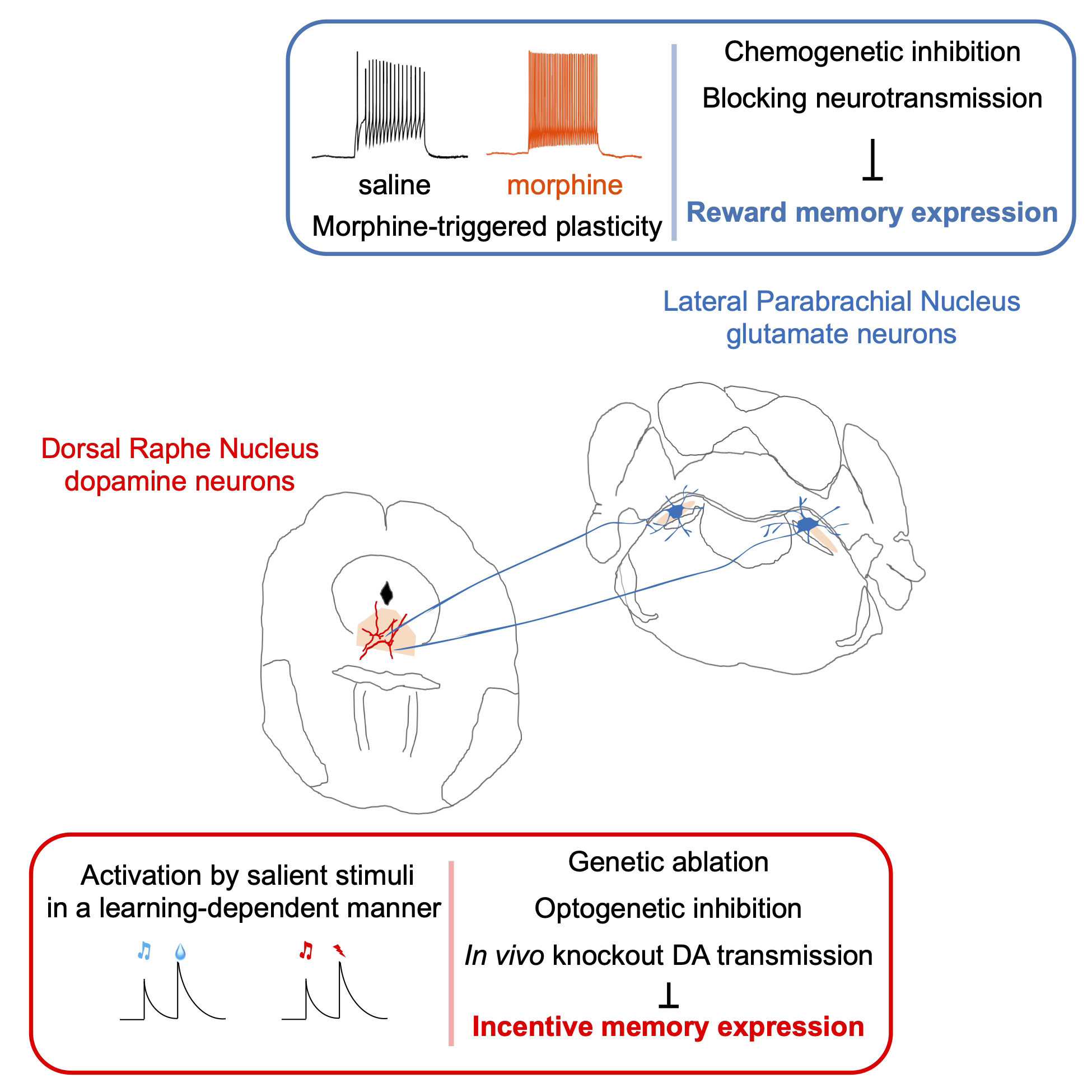Using morphine as the probe to search for functionally relevant inputs to DRN DA neurons, the authors further identified a glutamatergic pathway from the lateral parabrachial nucleus (LPB) to the DRN that specifically regulates reward processing. Morphine administration causes an increase of glutamatergic inputs from the LPB to DRN DA neurons, and this increase is mediated by the morphine-induced enhancement of DRN-projecting LPB neurons’ excitability. Silencing or blocking the neurotransmission of DRN-projecting LPB neurons impairs the expression of reward memory and the reward processing of DRN DA neurons.
