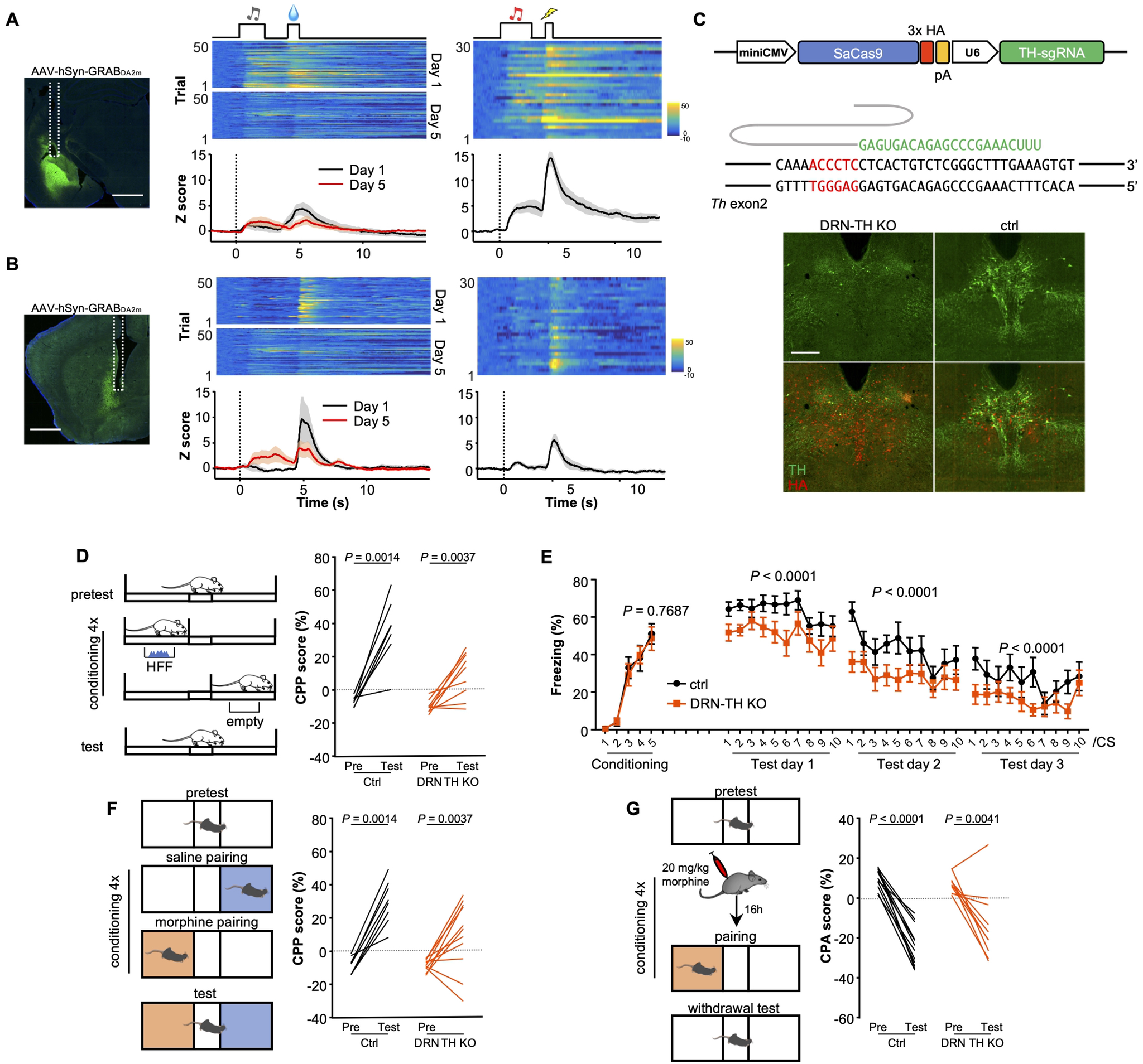 To investigate whether DRN DA neurons release DA to mediate their behavioral functions, the authors examined the DA transmission profiles in the major downstream targets of DRN DA neurons by using an optimized genetically-encoded DA sensor, GRABDA2mdeveloped by Dr. Yulong Li lab in Peking University. They observed transiently increased DA levels in both the central amygdala and the bed nucleus of the stria terminalis triggered by both rewarding and aversive stimuli. Further, they employed the AAV-mediated CRISPR/Cas9 technologyin vivoto knock out tyrosine hydroxylase (TH), a rate-limiting enzyme for DA biosynthesis, in the DRN. The loss of DA biosynthesis in the DRN significantly impaired the expression of natural and addiction memory.