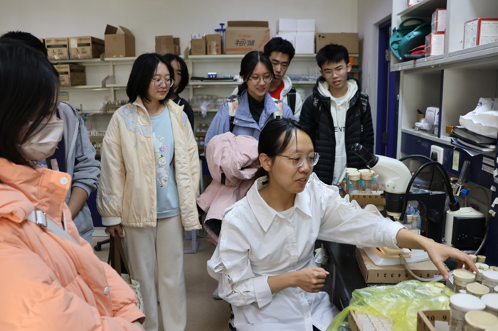 随后由学生会同学带领大家分别参观了袭荣文实验室、董梦秋实验室、齐湘兵实验室、沈博实验室、黄牛实验室、徐纯福实验室、徐国泰实验室及遗传筛选中心和生物仪器中心。同学们对自己感兴趣的科学问题与导师进行了深入的探讨。通过听取各实验室导师对本实验室研究方向及成果的介绍以及对实验仪器设备的参观,同学们更加全面深刻地了解到了生命科学的奥秘和广阔的发展前景,激发了他们对科研创新的热情,为今后从事科研学术发展奠定了基础。