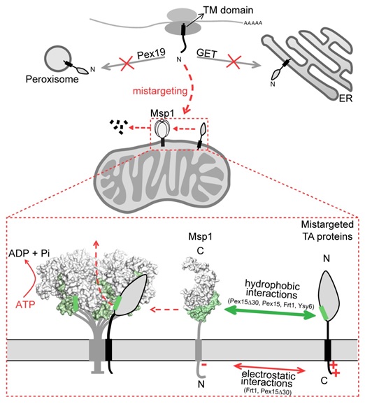 尾锚定蛋白是一类跨膜区在C端的膜蛋白,定位于特定的细胞器膜上。它们的定位信号包括C端跨膜区及其旁侧序列,被各种分拣机器识别。例如Pex19和GET通路分别分拣定位于过氧化物酶体和内质网的尾锚定蛋白。当分拣机器GET3缺失时,部分尾锚定蛋白会错误定位到线粒体外膜,并被线粒体AAA-ATPase Msp1特异识别并清除。线粒体外膜本身具有多个尾锚定蛋白,Msp1识别底物,区分错误和正确定位的尾锚定蛋白的分子机理尚不清楚。