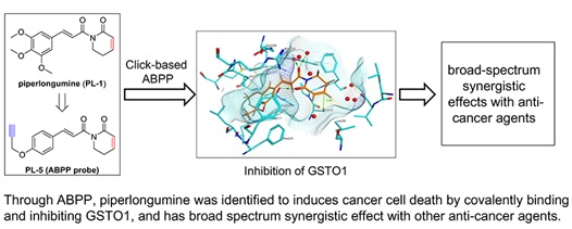 2019年4月9日,我所张志远实验室在《Chemical Communications》杂志上发表了题为“Activity-based Protein Profiling Reveals GSTO1 as the Covalent Target of Piperlongumine and a Promising Target for Combination Therapy for Cancer”的研究论文。该文章揭示了天然产物荜茇酰胺(piperlongumine)通过共价结合抑制GSTO1蛋白活性达到特异性杀伤癌细胞的作用,并发现GSTO1可作为癌症联合用药的有效靶点。