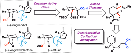 2019年5月15日,我所李超实验室(//www.lichaolab.com/)在《Journal of the American Chemical Society》杂志上在线发表题为“Tandem Decarboxylative Cyclization/Alkenylation Strategy for Total Syntheses of (+)-Longirabdiol, (-)-Longirabdolactone, and (-)-Effusin”的研究论文。该论文发现了一种金属铜催化的脱羧/环化/烯化串联反应,并成功地应用于C19位被氧化的贝壳杉烷型二萜的首次全合成。
