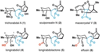 贝壳杉烷型二萜是一类结构非常复杂且具有重要生物活性的天然产物。目前,已有近千个此类化合物从植物中分离得到。在化学结构上,此类天然产物往往含有复杂的环系骨架结构(包括并环,螺环和桥环)和高度的氧化态,是有机合成界关注和研究的重点。在生物活性上,此类天然产物往往展现出抗菌,抗肿瘤和抗病毒等重要活性。其母体植物(香茶菜属植物)是一类常见的抗炎症中药,如冬凌草。具有高度氧化态的此类天然产物是有机合成的难点之一,尤其是C19位被氧化的螺环内酯类贝壳杉烷型二萜,因为C19位的选择性氧化会引起C4产生一个季碳中心,所以目前还没有成功的全合成报道。