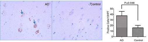 (图2:阿尔兹海默病人海马回区神经堆积显著超出同龄其他病人的p-MLKL信号,指示细胞程序性坏死同神经退行性疾病的联系)