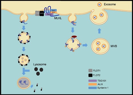 (图1:Flotillin介导的内吞和ESCRT介导的外泌体通过移除细胞膜结合磷酸化MLKL蛋白修复细胞坏死导致的细胞膜损伤)