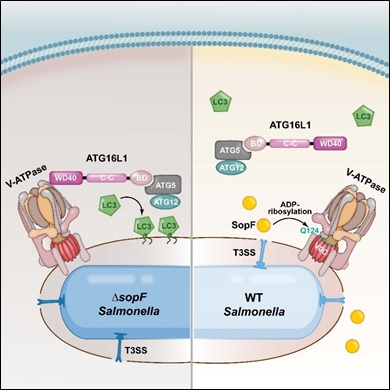 沙门氏菌经常被用作研究异源自噬机制的生物模型。然而, 人们很早就注意到, 侵入宿主细胞内的沙门氏菌仅在感染早期有少量细菌会被细胞自噬识别。除了研究宿主细胞中的天然免疫通路,邵峰实验室也长期致力于研究细菌效应蛋白抑制宿主的免疫识别过程。于是研究者猜想沙门氏菌中可能存在抑制异源自噬的效应蛋白。通过沙门氏菌转座子遗传筛选,研究者发现一个全新的沙门氏菌III型分泌系统(T3SS)效应蛋白,SopF,可以抑制异源自噬。sopF基因的敲除使得细菌被自噬识别的水平提高至80%。另外,研究者还发现,在真核细胞外源表达SopF可抑制不同种类细菌触发的自噬过程,但对于经典自噬通路却没有抑制作用。因此SopF的发现为研究异源自噬通路的机制提供了一个绝佳的突破口。