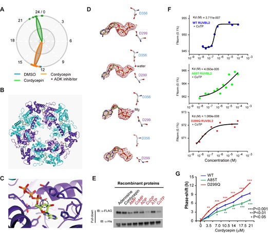 图2.CoTP与RUVBL2相互作用和调控生物钟时相的结构生物学基础。(A)抑制cordycepin磷酸化的ADK(adenosine kinase)inhibitor能够完全阻断cordycepin相位调节能力;(B,C)CoTP与RUVBL2蛋白结合的共晶结构解析;(D)RUVBL2蛋白水解CoTP动态过程。(E)CoTP和CoDP解离BMAL1/RUVBL2蛋白相互作用;(F)RUVBL2的D299Q和A85T突变体影响其与CoTP的结合亲和力;(G)RUVBL2的D299Q和A85T定点突变影响cordycepin相位调节能力。