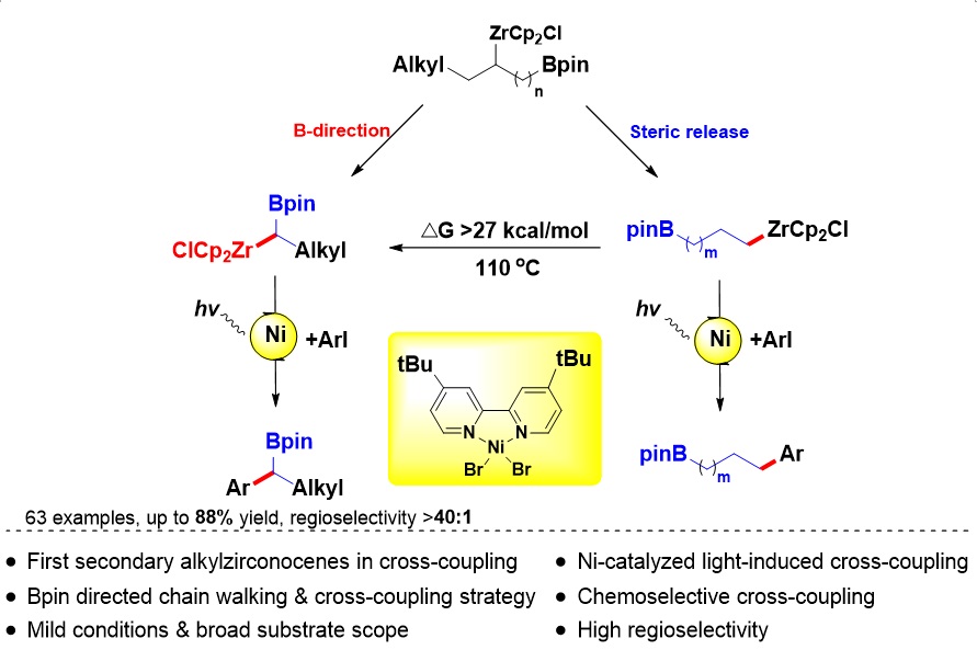 /北京生命科学研究所齐湘兵课题组在化学顶级期刊《J. Am. Chem. Soc.》杂志在线发表了题为“Chemoselective Cross-coupling of gem-Borazirconocene Alkanes with Aryl Halides”的研究论文(//pubs.acs.org/doi/abs/10.1021/jacs.0c03821)。有机锆试剂在烷烃长链上行走(“链行走”)并活化远端化学键特性被发现近半个世纪来(1974年),如何控制锆金属的选择性迁移,迁移方向以及如何活化烷烃端头单键等科学问题一直没有被解决。作者首次发现了烷基锆远程迁移的可控性,实现了硼酸酯对锆试剂“链行走”远程迁移的导向控制,高效构建了同碳锆硼物种。在此基础上,作者进一步开发了简单可见光促进镍催化的烷基锆硼试剂与芳基卤化物交叉偶联方法,实现了具有手性中心的二级烷基硼试剂的高效合成。本研究是该科研团队在突破可见光促进单一镍催化的烷基锆交叉偶联反应后的又一新的方向(//doi.org/10.1016/j.chempr.2019.12.010,Chem 2020, 6, 675-688)。