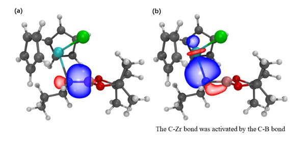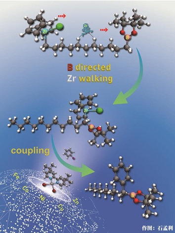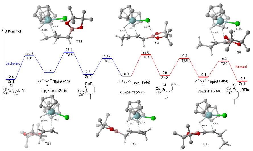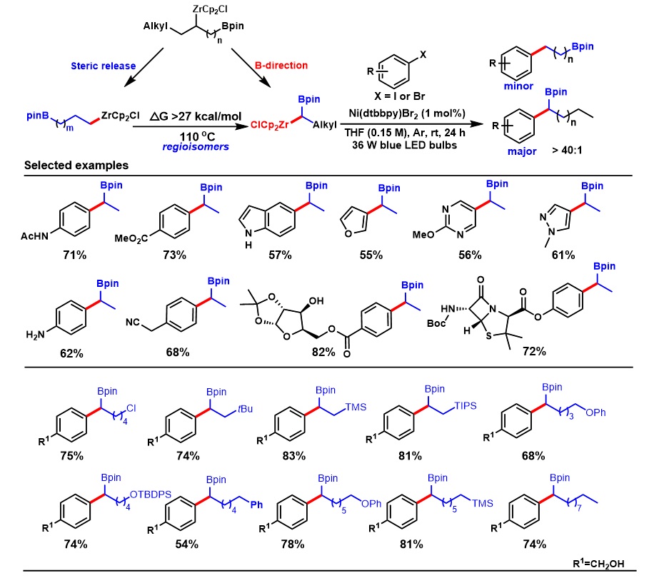 烷基锆试剂具有“链行走”远程迁移特点,但是锆试剂远程迁移通常生成热力学稳定的端头一级锆试剂,而由热力学稳定的一级锆试剂通过“链行走”远程“逆迁移”生成二级烷基锆试剂并没有被发现。该研究团队首次实现了通过端位硼酸酯基团诱导锆试剂选择性远程迁移方向的控制,成功实现了一级锆试剂远程逆迁移生成二级烷基锆硼试剂的过程。作者还通过DFT计算具体探索了硼酸酯导向锆试剂迁移的详细过程,解析了烷基锆硼试剂稳定性及其高反应活性的原因。
