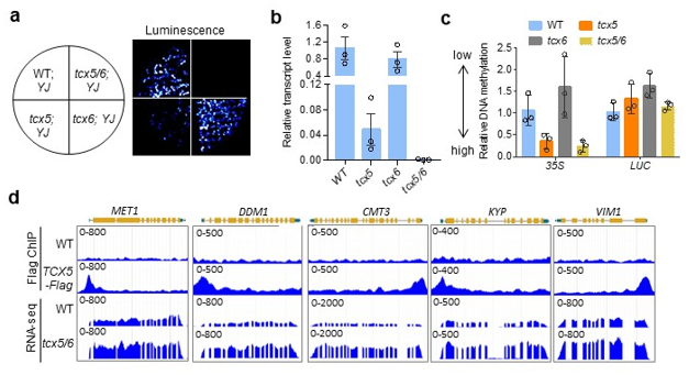 图1. 转录抑制子TCX5和同源基因TCX6 调控DNA甲基化维持基因。(a, b)YJ系统中荧光素酶报告基因的表达水平。(c)YJ系统中35S-LUC启动子上甲基化水平。(d)甲基化维持基因显示在TCX5-Flag ChIP-seq 和 RNA-seq上的信号。