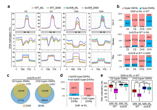 图2. TCX5/6在成熟叶片和茎尖分生组织中DNA甲基化差异。(a)WT和tcx5/6的成熟叶片(ML)和茎尖分生组织(SAM)中甲基化水平在第三条染色体上的分布。(b)在成熟叶片和茎尖分生组织中tcx5/6相对于WT差异甲基化区域数目。(c)韦恩图显示tcx5/6介导的CG或CHG 高甲基化差异区域在茎尖分生组织和成熟叶片中的重叠。(d)tcx5/6介导的CG和CHG 高甲基化差异区域在茎尖分生组织 相对于成熟叶片中的比例。(e)tcx5/6和WT的茎尖分生组织与成熟叶片 CG和CHG 高甲基化差异区域的 DNA甲基化水平。