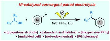 /北京生命科学研究所李超课题组(www.lichaolab.com)在J. Am. Chem. Soc.杂志上在线发表题为“Electrochemically Enabled, Nickel-Catalyzed Dehydroxylative Cross-Coupling of Alcohols with Aryl Halides”的研究论文。该论文报道了以自然界中广泛存在的醇类化合物与芳基卤代物为底物,在不分隔电解池中利用金属镍的催化作用发生脱羟基偶联反应形成C(sp2)–C(sp3)键的新方法。