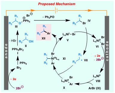 深入的机理研究表明:电解质中的溴负离子首先在电解池的阳极被氧化失去两个电子生成溴单质,溴单质与三苯基膦反应生成二溴三苯基膦。接着二溴三苯基膦与底物醇发生Appel反应,生成烷基溴。此烷基溴可以被低价镍还原形成烷基自由基。同时,二价的镍盐Ⅵ在阴极被还原得到两个电子生成零价镍Ⅷ。这一还原过程不仅实现了电解池正负极的氧化还原平衡,同时还释放被阳极氧化的溴负离子,保持了电解质的电荷平衡。还原得到的零价镍物种紧接着氧化插入到芳基溴之间形成二价的镍物种Ⅹ,此二价镍物种再与烷基自由基结合生成三价的镍物种Ⅺ,最终还原消除得到目标偶联产物。