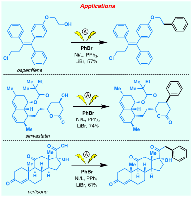 李超课题组开发的这种化学合成反应可以直接利用烷基醇与芳基溴代物作为偶联前体,底物适用范围较为广泛:普通的一级、二级醇,都能应用到反应中且能达到中等以上的收率;对于π-活化的醇能达到很高的收率;对于含有各种取代基的苯基溴代物,以及在部分药物分子中常见的吡啶,吲哚,苯并呋喃,二苯并呋喃,咔唑,苯并恶唑,吲唑,苯并咪唑等芳香杂环溴代物也可适用该反应体系。同时这个反应在一定程度上兼容酯基,羰基,醚,氰基,缩酮,Boc, Ts, 以及部分游离的氨基等官能团。更重要的是该方法在一些复杂药物分子和天然产物分子中也同样适用,例如雌激素受体调节剂ospemifene,降血脂药物simvastatin,止痛药bucetin,驱虫剂icaridin,香茅醇(citronellol), 叶绿醇(phytol), 可的松(cortisone)中的羟基官能团都能通过此方法进行化学选择性的脱羟基芳基化,这为复杂药物分子和天然产物分子的后期修饰和改造提供了非常好的方法。
