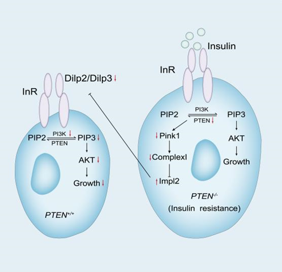研究人员发现pink1突变体果蝇体重明显变轻,且细胞变小,这也证实PINK1在细胞生长中发挥重要作用。之前的研究发现,PINK1是在Parkin介导的线粒体自噬中发挥作用的,而作者发现parkin突变的果蝇细胞大小并没有变化,且过表达Parkin不能挽救pink1突变体体重变轻的表型,所以PINK1在细胞生长中的调控作用并不依赖于Parkin。生物体内控制细胞的生长有两种调节方式,分别是细胞自主调控(cell-autonomous)和细胞非自主调控(non-autonomous)。进一步的研究发现,在果蝇肌肉中特异性敲低PINK1也会导致体重变轻,说明肌肉是PINK1调控果蝇生长的重要场所,证实PINK1调控果蝇的生长存在非自主式调控方式。此外,研究人员发现pink1突变体果蝇体内糖原和甘油三酯的含量发生变化,表现出高血糖症,同时突变体果蝇细胞中胰岛素信号通路被抑制,而这是由于在pink1突变体果蝇中一个分泌性的胰岛素以及胰岛素类似物的拮抗剂Impl2显著增加导致。更为重要的是,研究人员发现在组织中特异性地敲低PTEN的表达可以导致果蝇的体重变轻,而这一表型与晚期癌症患者身体严重消瘦的表型相似,这也与pink1突变体果蝇体重减轻的表型一致。研究人员发现回补PINK1能恢复由PTEN突变引起的全身生长抑制的表型,从而揭示PINK1在pten驱动的癌症相关的恶病体质中的潜在作用。该研究系统地揭示PINK1调节细胞生长的机制,解析PINK1在细胞内独立于Parkin的又一重要生理功能;全面理解pten驱动的癌症相关的恶病体质的机制,解析PINK1在调节PTEN突变引起的全身生长抑制中的作用,也为治疗癌症相关的恶病体质提供理论基础和策略。