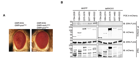 通过全基因组的RNAi筛选,作者发现敲低E3泛素连接酶POE能增强rack1对63Q的抑制作用。进一步的生化分析发现,RACK1作为支架蛋白,通过调控POE和ERK的相互作用,促进ERK的降解。增加ERK的水平能显著抑制63Q导致的细胞死亡,而敲低ERK能回复rack1对63Q的抑制作用,说明rack1通过调控ERK的降解缓解多聚谷氨酰胺疾病的进程。该研究揭示了RACK1在多聚谷氨酰胺疾病进程中的作用,并为RACK1/POE/ERK通路作为多聚谷氨酰胺疾病的治疗靶点提供了理论依据。