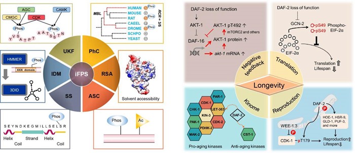左图:线虫功能磷酸化位点的预测工具iFPS。右图:IIS通过蛋白质磷酸化调节线虫寿命的多种机制。
