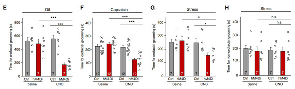 接下来,研究者深入分析自我梳理行为的中枢机制。三叉神经节中的感觉神经元向脑内三叉神经复合体投射。三叉神经复合体包括了三叉神经主核(principal trigeminal nucleus, Pr5)和三叉神经脊髓核(spinal trigeminal nucleus, Sp5)。其中三叉神经脊髓核的尾侧部(caudal part of the spinal trigeminal nucleus,Sp5C)因其与脊髓背角(spinal dorsal horn)的结构相似,又被称为延髓背角(medullary dorsal horn)。在脊髓背角的研究领域中,已知表达Cbln2, PV, CCK和NPY的神经元负责加工机械刺激的信息。因此研究者通过对Cbln2-IRES-Cre,PV-IRES-Cre,CCK-IRES-Cre和NPY-IRES-Cre小鼠的Sp5C注射AAV-DIO-hM4Di-mCherry病毒,腹腔注射CNO,对特定神经元进行化学遗传学抑制。他们发现,Cbln2+ Sp5C神经元被抑制时,能够使玉米油、辣椒素、压力应激诱导的面部自我梳理行为的持续时间下降,而化学抑制其他神经元亚型(PV+, CCK+, NPY+)造成的影响不显著。这暗示Cbln2+ Sp5C神经元可能是调控这一行为的神经环路中的重要组成部分。