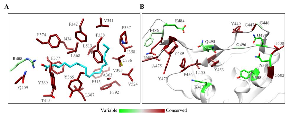 Toelzer等人在电镜研究中意外发现亚油酸分子结合在三个由spike蛋白中的两个相邻RBDs组成的复合型结合口袋中。与apo spike相比,亚油酸的结合使得spike蛋白中三个RBDs之间的结合更加紧密,将spike构象锁定在无法与ACE2结合的“闭合”状态。随后,北京生命科学研究所的郑三多实验室也有类似发现。本研究团队对此FFA结合位点氨基酸残基的保守性进行了分析,发现除R408外,其他残基都高度保守,保守性远远高于与ACE2结合界面处的残基(图2)。这启发研究团队,针对此保守的FFA结合位点开发小分子调节剂,有望以变构调节的方式改变spike蛋白的构象偏好,进而干扰病毒侵染细胞的过程。
