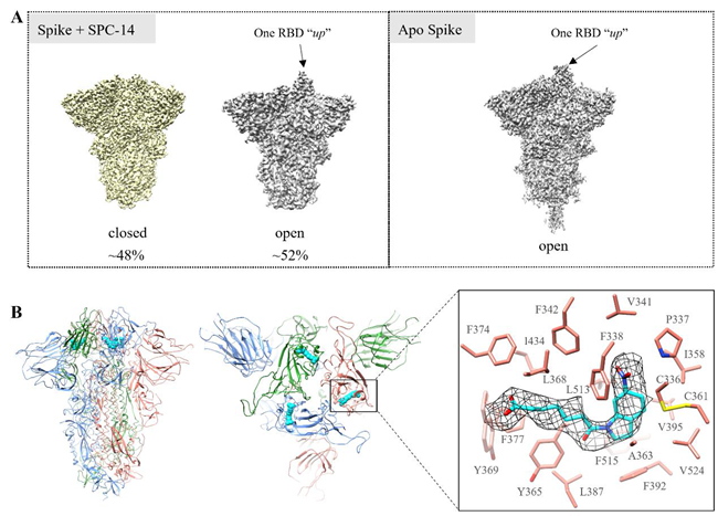 图5(A)spike蛋白在有无SPC-14加入下的冷冻电镜密度图。(B)spike蛋白与SPC-14复合物的电镜结构。