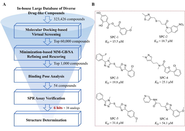 图3(A)逐级虚拟筛选策略流程图及其(B)发现的苗头化合物