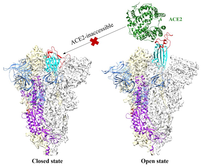 图1融合前spike蛋白的两种构象状态:“闭合”(左)和“开放”(右)