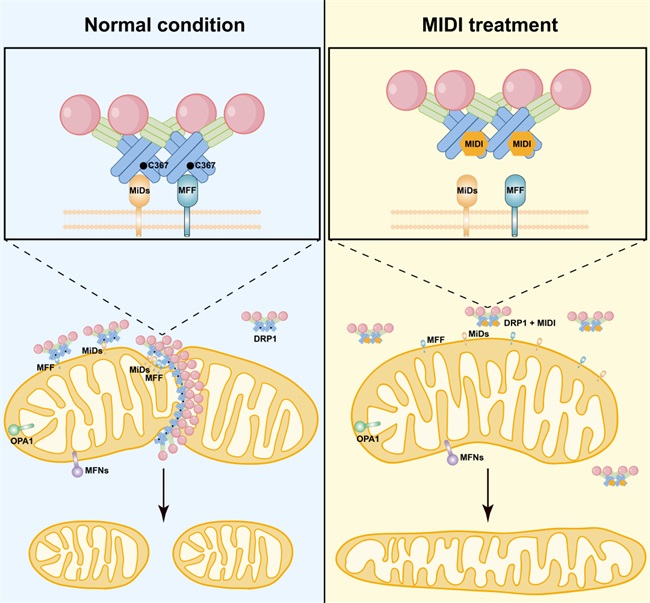 在许多病理情况下,细胞应激和损伤导致线粒体过度分裂,促进细胞死亡。线粒体过度分裂与退行性疾病广泛相关,抑制线粒体分裂可减轻神经系统及其他器官退行性病变。在本研究中,作者得到了高效且低毒性小分子MIDI。MIDI能够有效促进线粒体融合并且阻断有害应激诱导的线粒体分裂。作者进一步分析MIDI的作用机理,表明MIDI靶向调控线粒体分裂的关键GTPase DRP1。MIDI通过与DRP1-C367位点共价结合,直接阻断DRP1与其线粒体受体的互作,从而抑制线粒体分裂。最后作者开发了一个靶向DRP1与其受体互作的新型DRP1抑制剂,为未来进一步开发线粒体分裂抑制剂提供了新的思路。