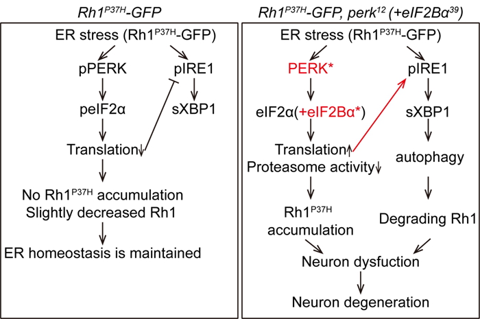 通过进一步研究,作者阐明了PERK信号通路是内质网应激状态下维持视紫红质稳态的主要途径。持续内质网应激时PERK/eIF2α保持激活状态并抑制IRE1/XBP1活性,此时阻断PERK/eIF2α通路会引起IRE1/XBP1的过度激活从而引发细胞自噬(autophagy),并最终通过内质网自噬(ER-phagy)选择性降解野生型视紫红质(图2)。并且,在adRP果蝇模型中上调PERK的表达可以阻止自噬的发生并减缓果蝇感光细胞退化。这些发现揭示了内质网自噬在adRP中的病理作用,并表明增强PERK活性可用于治疗内质网应激相关疾病。