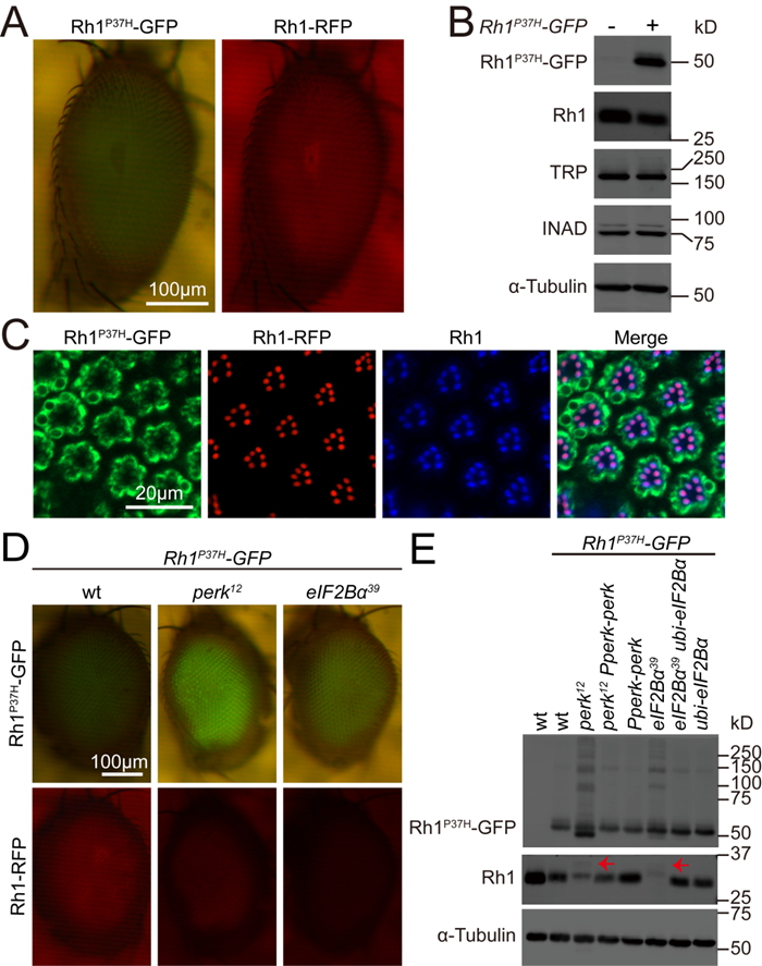 图1perk和eIF2Bα突变打破了adRP果蝇模型Rh1P37H的视紫红质稳态