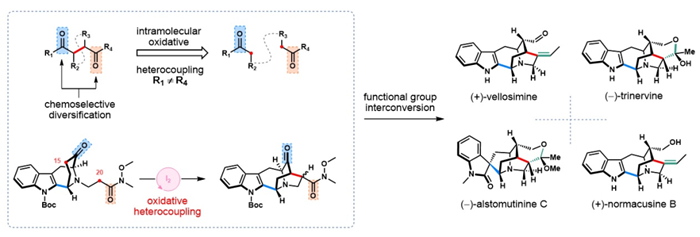 Sarpagine天然产物是一类提取自具有药用价值的夹竹桃科(Apocynaceae)萝芙木属(Rauwolfia)植物的单帖吲哚生物碱,具有抗癌、抗炎、镇痛等丰富的生物活性。该Sarpagine家族生物碱由于具有复杂的氮杂[2.2.2]辛烷笼状核心骨架,一直是近几十年来合成化学界的研究热点。齐湘兵实验室开发了由碘单质(I2)介导的分子内交叉氧化偶联反应,实现了核心氮杂[2.2.2]辛烷骨架的高效合成,并成功应用于sarpagine家族成员(−)-trinervine,(+)-vellosimine,(+)-normacusine B 以及(−)-alstomutinine C的发散式全合成。