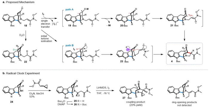 过渡金属氧化剂与碘单质所体现出的巨大活性差异促使作者进一步思考该关键反应过程中的科学问题,并针对双羰基氧化偶联的机理问题进行了进一步的探索。以往的文献报道中,关于烯醇氧化偶联反应的机理主要分为两类,一般认为由过渡金属参与的烯醇氧化通常涉及自由基的生成。而由I2介导的氧化偶联反应机理一直存在争议(Radical Coupling vs. SN2)。作者发现在自由捕获剂TEMPO参与的情况下该反应依然可以顺利进行,没有自由基被捕获的产物生成。作者利用亚环丙基酮对1,4-加成的高活性,在Weinreb酰胺偶联位点的临位引入了三元环结构,得到偶联前体26。该底物在LiHMDS/I2条件下可以顺利生成偶联产物27,而没有生成任何由自由基导致的开环产物。结合TEMPO捕获与自由基钟(Radical Clock)实验的结果,作者推测该转化很可能经历分子内的SN2反应,而不同于以往文献报道的由过渡金属氧化剂介导的自由基机理。