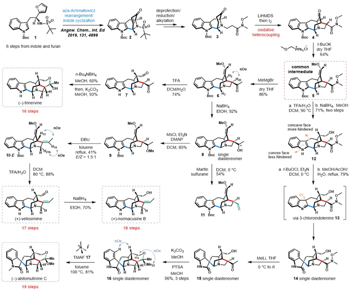 在氧化偶联产物4的基础上,作者通过Wittig反应,化学选择性地将C16酮羰基转化为烯基醚5。作者在化合物5的基础上,通过Weinreb酰胺的甲基化得到甲基酮6,再经过水解/醛的选择性还原/差向异构反应,实现了(−)-trinervine的不对称全合成(16步)。作者接着从甲基酮6出发,先将酮羰基还原成二级醇8,在通过脱水的方式构建C20的环外双键过程中发现脱水剂Martin sulfurane以专一的区域选择性给出了端烯产物11,而非设计的内烯烃10,作者认为选择性源自于C20-H与C18-H的反应动力学差异。为了实现正确的区域选择性,作者先在二级醇8上引入甲磺酰基,再通过碱性条件下的E2消除成功构建了环外双键(E/Z=1.5:1)。接下来通过水解与还原,最终实现了(+)-vellosimine(17步)与(+)-normacusine B(18步)的不对称全合成。在完成前三者的合成后,作者将目光转向了结构更加复杂,更具挑战性的螺环吲哚天然产物alstomutinine C的全合成上。从烯基醚5出发,先通过化学选择性水解/还原反应得到了伯醇12。在此基础上,作者通过t-BuOCl介导的氧化重排实现了螺环吲哚14的立体选择性构建,新生成的季碳中心为单一构型。在将Weinreb酰胺转化为甲基酮15后,C20的差向异构生成了半缩酮,在将半缩酮转化为缩酮16后,作者利用高化学选择性的酰胺甲基化试剂-四甲基氟化铵(TMAF),实现了酰胺氮的甲基化,从而通过十九步完成了(−)-alstomutinine C的不对称全合成。