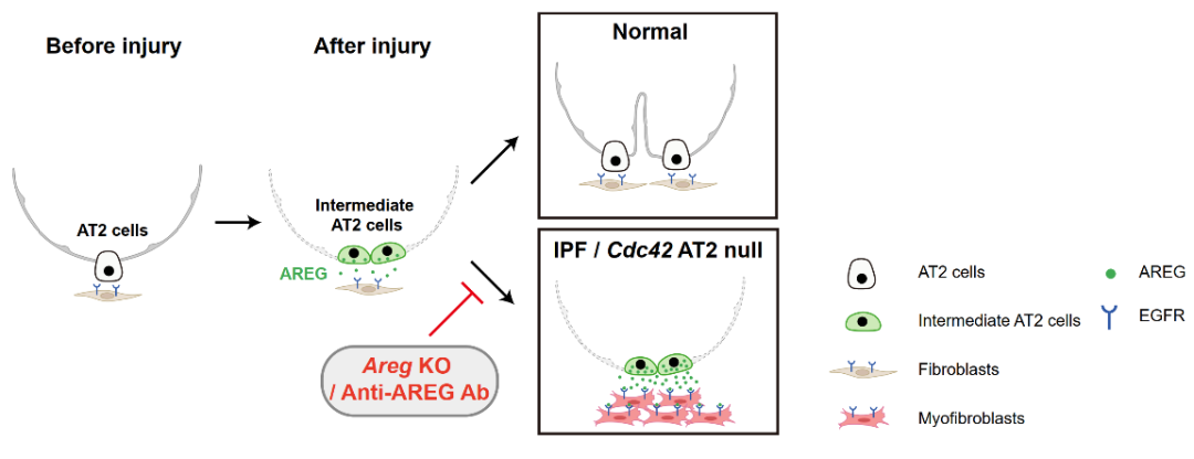 综上,本研究基于进展性肺纤维化动物模型和临床转化医学研究系统性地揭示了中间态肺泡干细胞及其表达的AREG在肺纤维化发生和发展中的关键作用,并发现了其表达水平与IPF疾病严重程度成正相关(Figure 1)。这一发现不仅解决了中间态的肺泡干细胞如何参与进行性肺纤维化的细胞和分子机制,加深了对IPF病理机制的理解,还为开发新的治疗方法提供了重要线索,让靶向肺泡干细胞中的AREG成为可能治疗IPF的一种新策略。此外,这一研究还为其他类型的纤维化疾病的研究提供了参考,提示靶向AREG在其他纤维化疾病中也具有潜在疗效。总之,本研究不仅对理解和治疗IPF具有重要意义,还可能对更广泛的纤维化疾病研究和治疗提供了新思路。