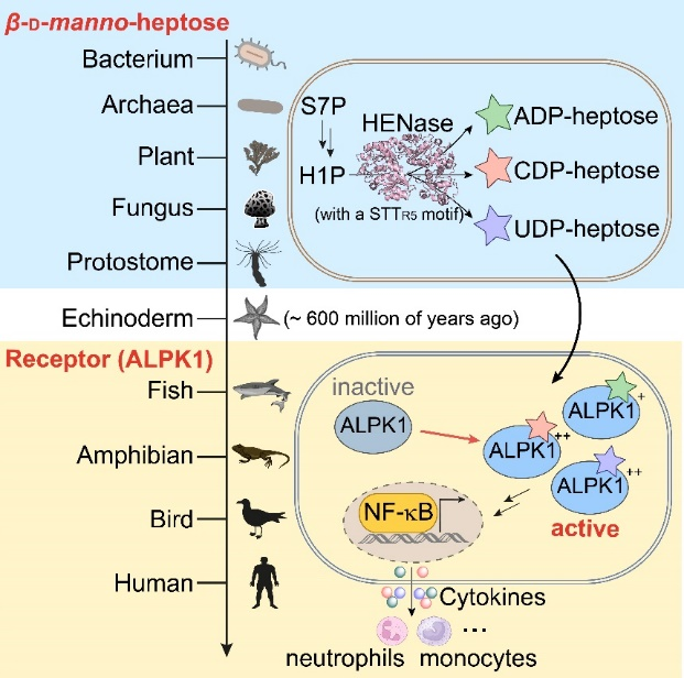 本研究中,研究团队合作证明NDP-甘露庚糖合成酶广泛分布于细菌、古菌、真核生物甚至病毒中。证实跨界来源的NDP-庚糖核苷转移酶不仅可以合成ADP-甘露庚糖,还能够合成两种新型的NDP-甘露庚糖——CDP-甘露庚糖和UDP-甘露庚糖。对甘露庚糖核苷转移酶的深入研究发现,保守的STTR5序列是这类酶能够合成CDP-和UDP-甘露庚糖的标志性特征。细胞及小鼠水平的生化与动物实验证实不同来源的CDP-和UDP-甘露庚糖能够作为免疫激动剂,激活受体ALPK1依赖的天然免疫,且作用效果要强于ADP-甘露庚糖。系统进化分析暗示,在后口动物丧失合成NDP-甘露庚糖的能力后,一些脊椎动物如哺乳动物,进化出了ALPK1作为模式识别受体以识别跨界来源的NDP-甘露庚糖分子。