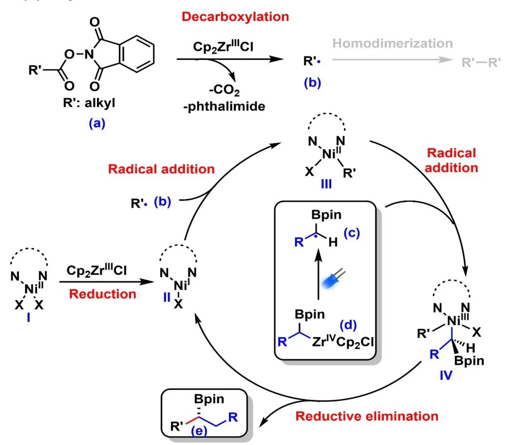综上,齐湘兵实验室开发了可见光促进的镍催化烷基锆硼试剂与廉价易得的一级羧酸NHPI酯的不对称自由基偶联方法,高效合成了一系列具有高应用价值的手性烷基硼化合物。利用烷基锆试剂自身独特的光敏特性及其在对映选择性自由基交叉偶联反应中的潜力,为光氧化还原促进的脱羧偶联反应提供了新的思路。