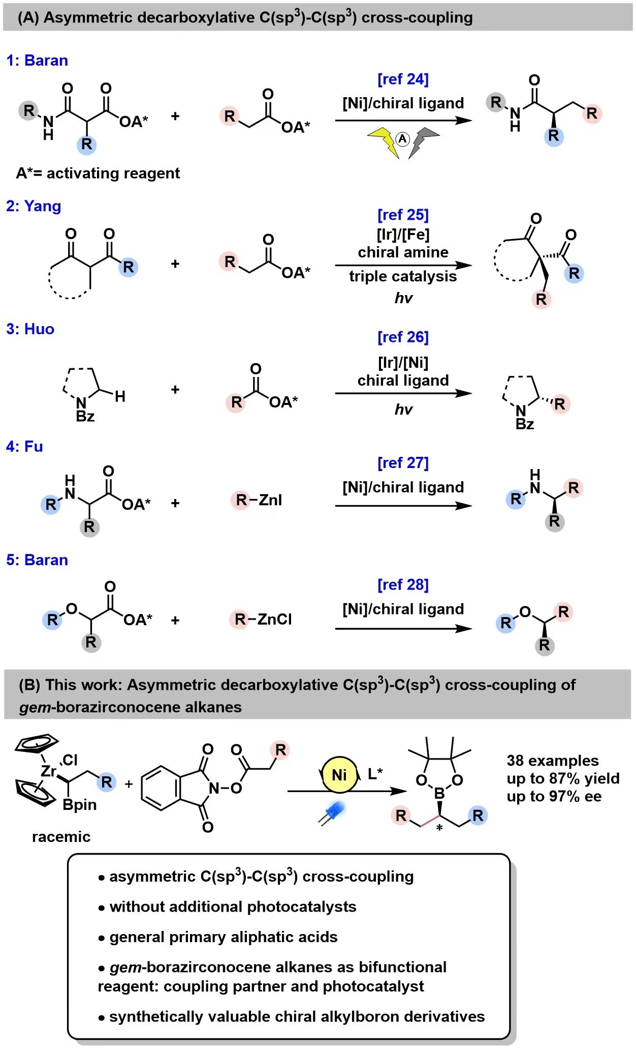 /北京生命科学研究所齐湘兵课题组在美国化学会旗下化学旗舰期刊《Journal of the American Chemical Society》杂志在线发表了题为“Enantioselective Decarboxylative C(sp3)-C(sp3) Cross-Coupling of Aliphatic Redox-Active Esters with gem-Borazirconocene Alkanes”的研究工作。天然丰富廉价易得的脂肪族羧酸及其衍生物因其稳定性,低毒性成为构建复杂分子框架最丰富和多样化的化学元件之一。过去几十年来大量过渡金属催化的脱羧交叉偶联反应被开发用于构建新的碳碳键和碳杂原子键。脱羧交叉偶联反应的高化学选择性和官能团耐受性使得生物活性分子和天然产物的后期多样化修饰成为可能,为探索药物化学空间提供了广泛的途径。尽管脂肪酸不对称脱羧交叉偶联反应已经取得了一些进展,但脂肪酸底物仍局限在α-杂原子或 α-羰基稳定的羧酸前体,与具有稳定自由基能力的α-杂原子和 α-羰基羧酸相比,通过未活化的一级脂肪羧酸脱羧产生不稳定的一级烷基自由基而实现的C(sp3)-C(sp3)交叉偶联反应仍未得到充分发展(Figure 1)。因此,开发新的未活化的一级脂肪族羧酸及其衍生物不对称脱羧偶联反应具有重要的应用潜力。此外,烷基金属参与的不对称脱羧偶联是实现一级脂肪酸转化的高效策略之一,然而目前已知的参与不对称脂肪酸脱羧偶联的烷基金属试剂主要局限在烷基锌试剂,相比烷基锌试剂,烷基锆试剂可以通过天然来源丰富的烯烃在温和条件下由氢锆化反应制备,这种多功能有机金属物种表现出卓越的官能团耐受性、独特的光化学反应活性,以及通过其“链行走”能力促进远程 C−H键官能化的能力,成为了构建手性C(sp3)-C(sp3) 化学键的强大工具(Chem, 2020, 675; JACS, 2020, 11506; Chem, 2023, 2222)。对烷基锆试剂光反应活性的持续探索为开发不对称光氧化还原方法开辟了新途径。本研究结合脂肪族羧酸和烷基锆试剂的优势,开发了一种可见光促进的、镍催化的对映收敛 C(sp3)-C(sp3) 交叉偶联反应,实现了廉价易得简单一级脂肪族羧酸 NHPI 酯与烷基锆硼试剂的不对称交叉偶联,高效立体选择性的合成了具有高应用价值的手性烷基硼化合物,可以在保留手性中心的情况下立体专一性地衍生出大量手性分子。