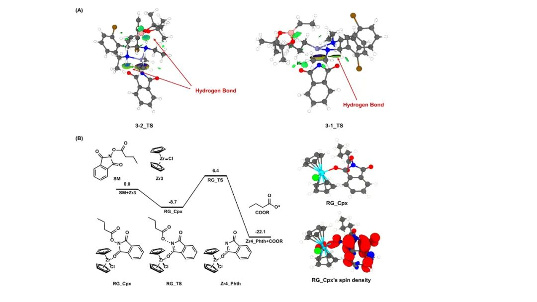 通过分析手性决定步骤的过渡态结构,发现在两种过渡态中,邻苯二甲酰亚胺离子都通过 N-Ni 配位键以及与二胺配体的氢键与镍中心结合。在优势构象中,烷基硼自由基的频哪醇部分与手性二胺配体形成氢键,可以避免来自配体溴原子的空间位阻,相反,在不利构象中,为了减轻与手性配体的空间位阻,烷基硼自由基丢失了这一部分氢键。为了进一步探索Zr(III)介导的NHPI酯脱羧,作者同样对此过程进行了DFT计算。NHPI酯最初与Cp2Zr(III)Cl 复合物结合,形成稳定的中间体 RG_cpx(Figure 3),自旋密度图显示,未配对电子主要分布在邻苯二甲酰亚胺环上。随后,RG_cpx中N-O键均裂断裂,在热力学和动力学上均有利,佐证了低价态锆促进的NHPI酯还原过程,并为脱羧前体自由基的产生提供了新的思路(Figure 3)。