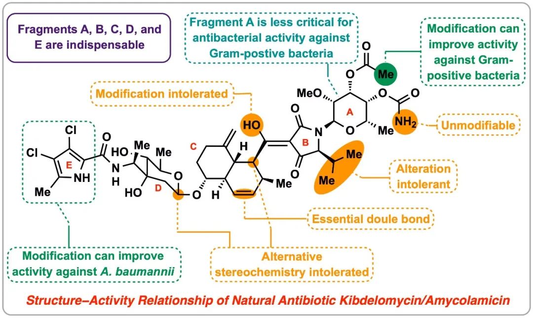 近日,该课题组与北京大学人民医院的王辉教授课题组合作,以此前开发的汇聚式全合成路线为基础,系统性地解析了AMM/KBD的构效关系 (图2),并发现了一个具有更强抗菌活性和更佳安全性的类似物。相关成果发表在Angew. Chem. Int. Ed.上,题为"Establishing the Comprehensive Structure−Activity Relationship of the Natural Antibiotic Kibdelomycin/Amycolamicin"。