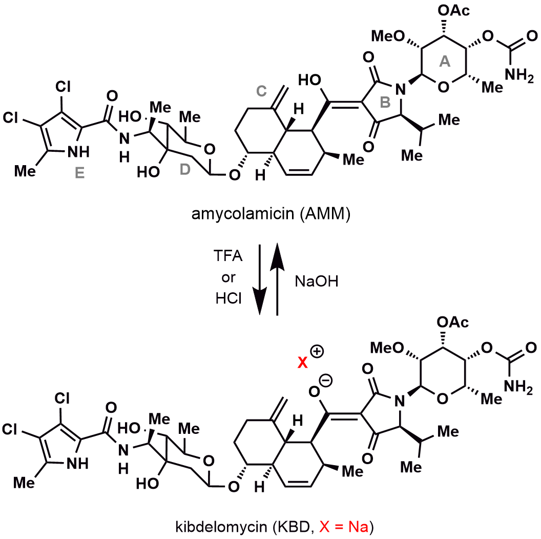 Amycolamicin (AMM)和kibdelomycin (KBD)是两个极具潜力的天然抗生素,它们分别于2009年和2011年被分离报道。它们不仅具有独特且复杂的化学骨架,还能通过抑制细菌DNA的合成来发挥杀菌作用,尤其对多种革兰氏阳性耐药菌展现出强大的抗菌活性(MIC = 0.52 μg/mL)。此外,Merck公司的研究表明,KBD通过独特的“U型”双臂结合模式与其靶蛋白细菌II型拓扑异构酶Gyrase B和Par E结合,进而发挥抗菌作用。其中KBD的下结合臂占据GyrB/ParE的ATP结合口袋,上结合臂则与酶二聚体之间的二聚界面相互作用。这种新型且牢固的结合模式不仅使KBD与其他细菌II型拓扑异构酶抑制剂(如新生霉素和临床使用的喹诺酮类抗生素)之间无交叉耐药性,还赋予了其极低的耐药突变率(<5 × 10-10)。因此,AMM和KBD被视为抗生素药物开发中极具前景的候选化合物。其中,Merck公司在推动KBD成药方面做了大量的研究,但到目前也未能成药。从其相关报道来看,针对KBD进行化学修饰改造,推动其成药势在必行。但鉴于KBD化学结构极其复杂,直接进行化学修饰改造难度极大,因此关于KBD的构效关系(SAR)研究尚未有报道。