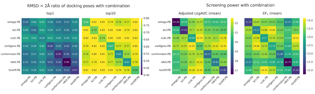 基于这一结论,作者推测不同采样方法的结果可能具有互补性。为验证这一点,作者尝试将采样方法进行两两组合,以考察组合采样方法对上述分子对接任务的影响。结果表明,在对接能力和筛选能力上,组合采样方法能够进一步提升分子对接的整体表现。