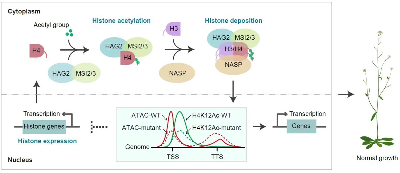 在细胞质中,HAG2-MSI2/3或NASP单独突变不会引起组蛋白H3和H4蛋白水平的变化,但两者同时突变则导致细胞质组蛋白H3和H4的蛋白总体水平显著降低,表明组蛋白乙酰化模块HAG2-MSI2/3与组蛋白伴侣NASP协同维持细胞质组蛋白H3和H4的蛋白水平。因此,拟南芥NuB4复合体组分通过结合组蛋白H3和H4,促进它们在细胞质中组装和积累(图2)。