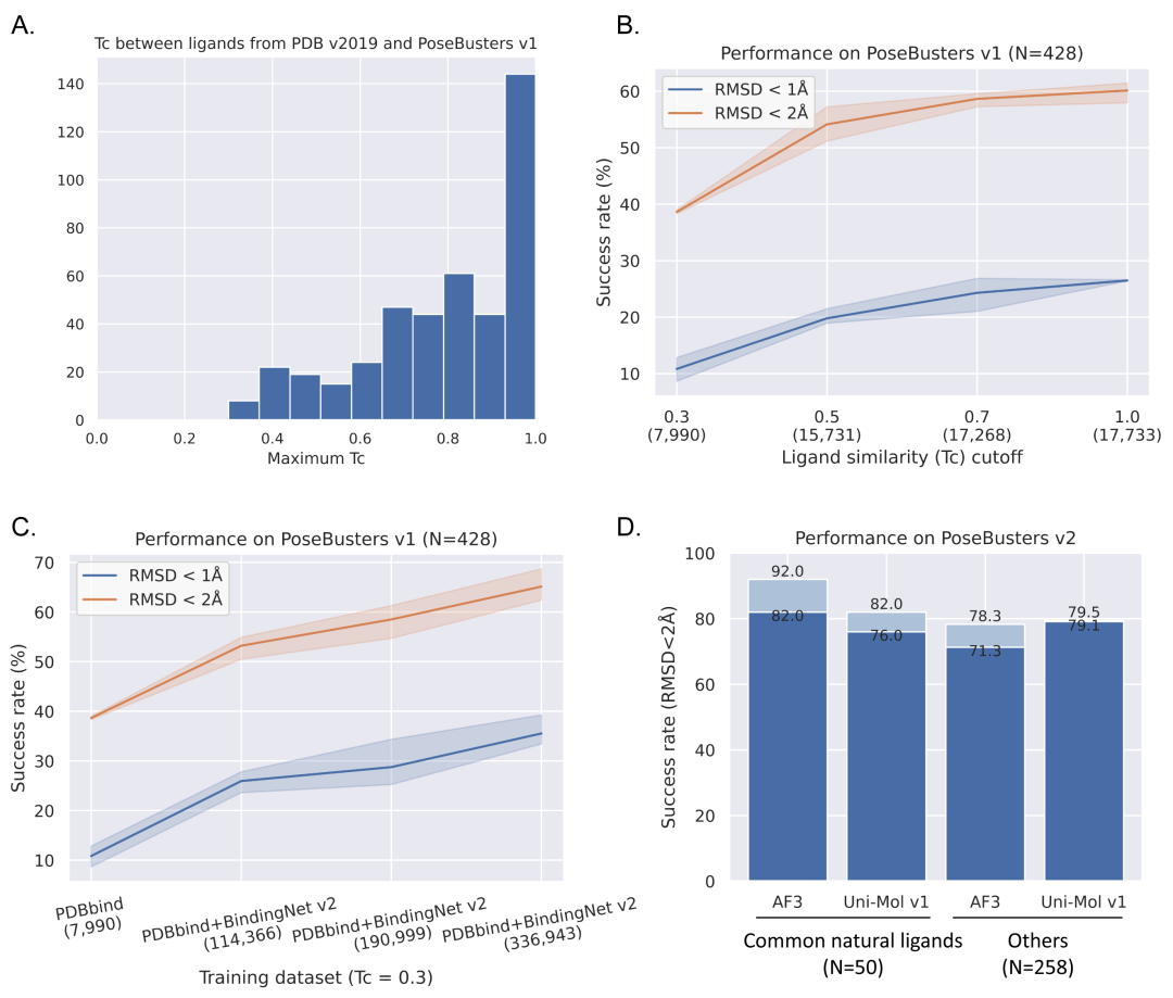 /北京生命科学研究所黄牛实验室于《npj Drug Discovery》杂志在线发表题为“Augmented BindingNet dataset for enhanced ligand binding pose predictions using deep learning ”的研究论文。在BindingNet v1数据集的模板匹配技术基础上,创新性地提出了基于片段化结合形状与静电匹配的多层次模板匹配流程,成功构建出规模远超BindingNet v1近十倍规模的蛋白-配体相互作用数据集— BindingNet v2。此数据集覆盖1794个蛋白靶点,包含689,796个蛋白-小分子配体复合体结构模型及其相应的实验活性数据,极大地提升了AI模型在蛋白-配体复合体预测任务上的泛化能力。尤其在仅使用Tc < 0.3的数据(不包含同测试集中结构类似的分子)训练时,Uni-Mol模型在PoseBusters测试集上的泛化能力从38.55%大幅跃升至74.07%。