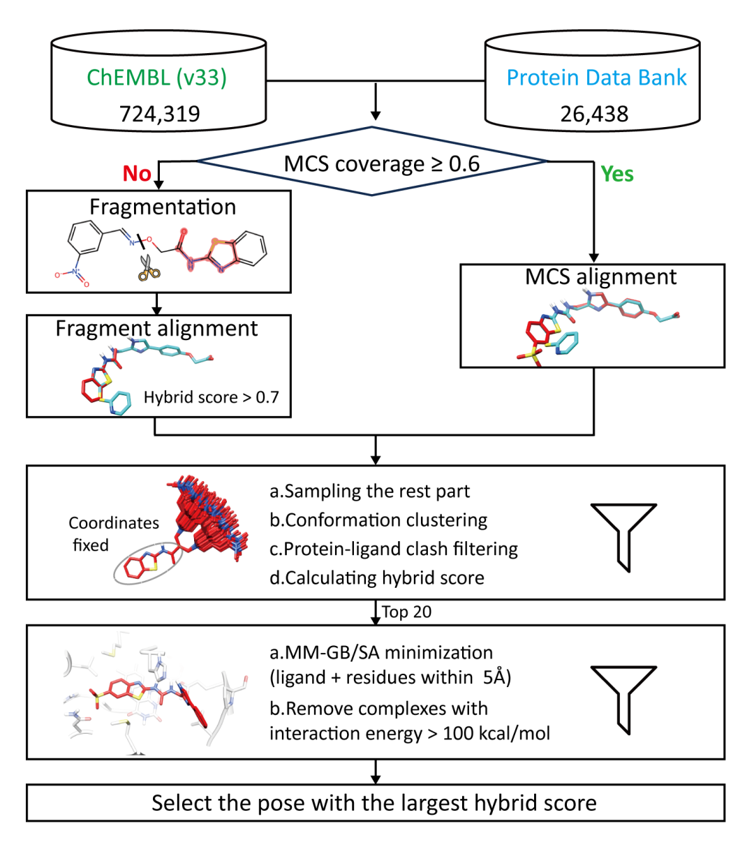 b)若未达到占有率要求,则对候选分子进行片段化处理,并借助SHAFTS 工具探寻片段与模板分子间三维形状及药效团叠合程度(即 hybrid score)最高的构象。