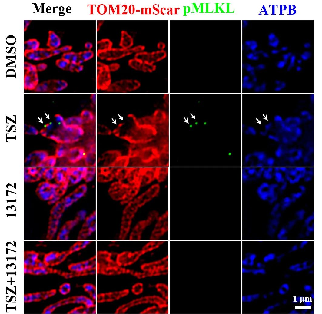 多种线粒体应激压力可导致mtDNA释放,例如线粒体内核酸酶EndoG缺失或mtDNA结合蛋白TFAM缺失等。然而程序性坏死细胞中这些蛋白并未减少。mtDNA释放的可能途径包括线粒体通透性转换孔(mPTP)、VDAC寡聚化孔、Gasdermin家族蛋白或Bax/Bak等。但mPTP和VDAC寡聚化的抑制剂均不能抑制此mtDNA释放。由于程序性坏死诱导体系中Z-VAD-fmk的存在,Gasdermin不会被切割活化。Bax/Bak双敲除细胞也不能抑制程序性坏死中的mtDNA释放。最终,研究人员确定寡聚的pMLKL是执行mtDNA释放的关键。pMLKL寡聚化抑制剂13172可抑制mtDNA释放。在线粒体膜开口处也观察到了pMLKL的共定位。在纯化的线粒体组分中检测到pMLKL富集。线粒体膜富含带负电的心磷脂,而MLKL对心磷脂具有高亲和性。PLSCR3是负责将心磷脂从线粒体内膜转运至外膜的翻转酶,其缺失可抑制程序性坏死导致的mtDNA释放。