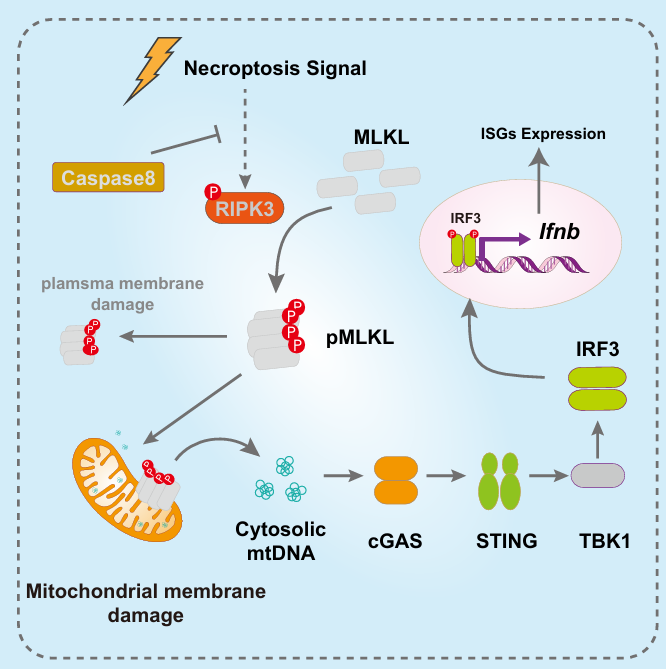 /北京生命科学研究所的王晓东实验室在Molecular Cell杂志上以封面论文形式发表了题为MLKL activates the cGAS-STING pathway by releasing mitochondrial DNA upon necroptosis induction的研究。该研究发现,在程序性坏死细胞中,I型干扰素表达上调,其中Ifnb上升最为显著。敲除程序性坏死关键蛋白RIPK1、RIPK3或MLKL可完全抑制Ifnb表达,且此效应独立于细胞膜破损。