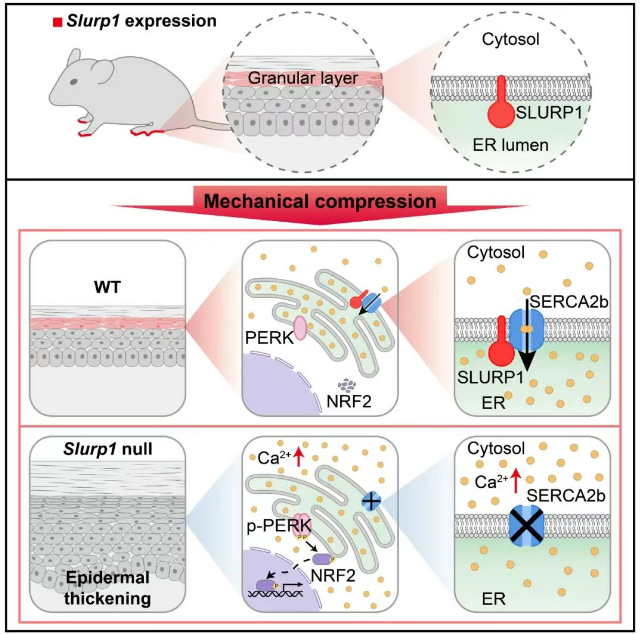 实时钙成像结果显示:在无细胞外钙的培养条件下,对表皮细胞施加压力可诱导其胞质内Ca2+浓度升高;而SLURP1蛋白表达或SERCA2b激动剂CDN1163处理均能显著抑制这一现象,并使pPERK水平恢复至正常。上述结果表明,机械力抑制了SERCA2b的Ca2+转运功能,而SLURP1有助于维持其活性。体内实验进一步证实,CDN1163处理显著减轻Slurp1 KO小鼠表皮异常增厚。这些结果共同支持以下机制:掌跖部位长期承受的机械力会抑制钙泵SERCA2b的功能,导致胞质内Ca2+浓度升高,从而激活pPERK-NRF2信号通路,最终引发表皮病理性增厚。特异性表达于掌跖表皮颗粒层细胞中的ER膜蛋白SLURP1则能够维持压力条件下SERCA2b的功能,稳定胞内钙稳态,进而维持表皮稳态(图1)。