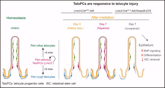 静态干细胞的一个常见特性是能够响应细胞损伤并快速参与修复过程。为了研究TeloPCs是否具备类似功能,研究人员通过建立辐射引起的肠道损伤修复模型,并结合可遗传诱导的白喉毒素靶向杀伤系统(Lmo3-CreERT2; Ai6; Rosa26-DTA)进行了实验。结果发现,肠峡部周围的TeloPCs能够响应辐射引起的肠道损伤,并通过快速的细胞增殖与迁移,在七天内重建肠道内受损的特络细胞及其提供的肠道微环境信号。然而,当TeloPCs受到白喉毒素靶向杀伤后,肠道则无法在辐射损伤后重建受损的特络细胞,导致肠道上皮的BMP信号通路的活性及肠上皮的正常分化均无法得到及时重建。与此同时,研究人员也利用另一个小鼠模型:Lmo3-CreERT2; Ai6; Rosa26-iDTR,在稳态情况下追踪和标记隐窝周围的特络细胞。通过往小鼠腹腔内注射白喉毒素以杀伤隐窝周围的特络细胞,结果发现隐窝周围特络细胞的缺失可导致肠道干细胞的标记基因Olfm4的表达降低或消失,表明TeloPCs产生的隐窝周围特络细胞参与调控肠道干细胞的自我更新。