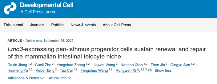 交叉医学研究院袭荣文团队在《Developmental Cell》期刊上在线发表了题为“Lmo3-expressing peri-isthmus progenitor cells sustain renewal and repair of the mammalian intestinal telocyte niche”的研究论文。该论文首次发现一群位于哺乳动物肠峡部(isthmus)的特络细胞祖细胞(telocyte progenitor cells,简称TeloPCs)负责肠道特络细胞的稳态维持和再生。在正常情况下,TeloPCs通过缓慢的增殖与迁移分化,维持隐窝和绒毛周围特络细胞的更新。当特络细胞层受损,TeloPCs可以被激活,快速修复特络细胞层,从而迅速重建肠道干细胞的自我更新与分化微环境。